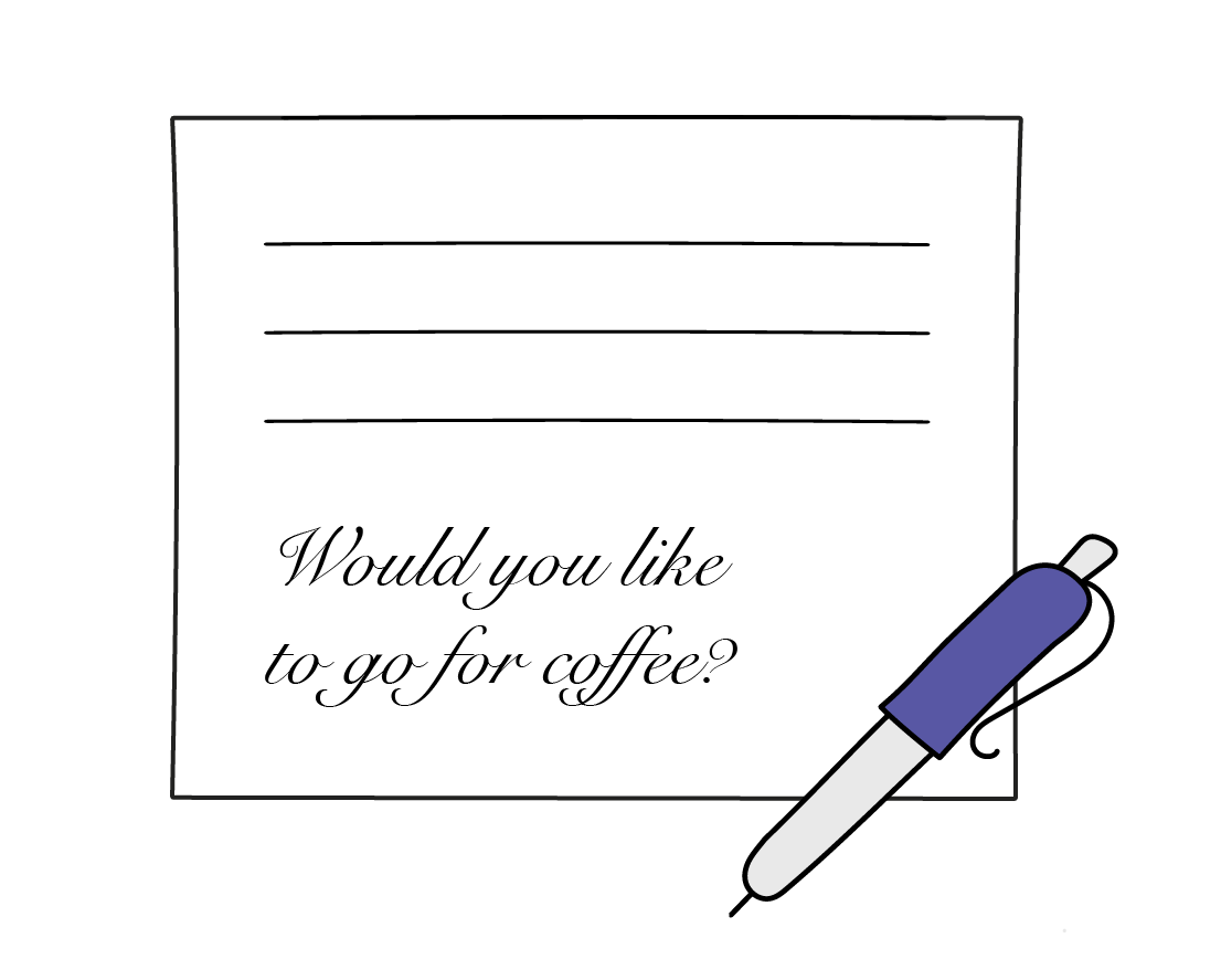 Using a 3x5 Post-it note, I wrote down a few traits Rob’s writing indicated and at the end wrote, “Would you like to go out for a coffee?”
