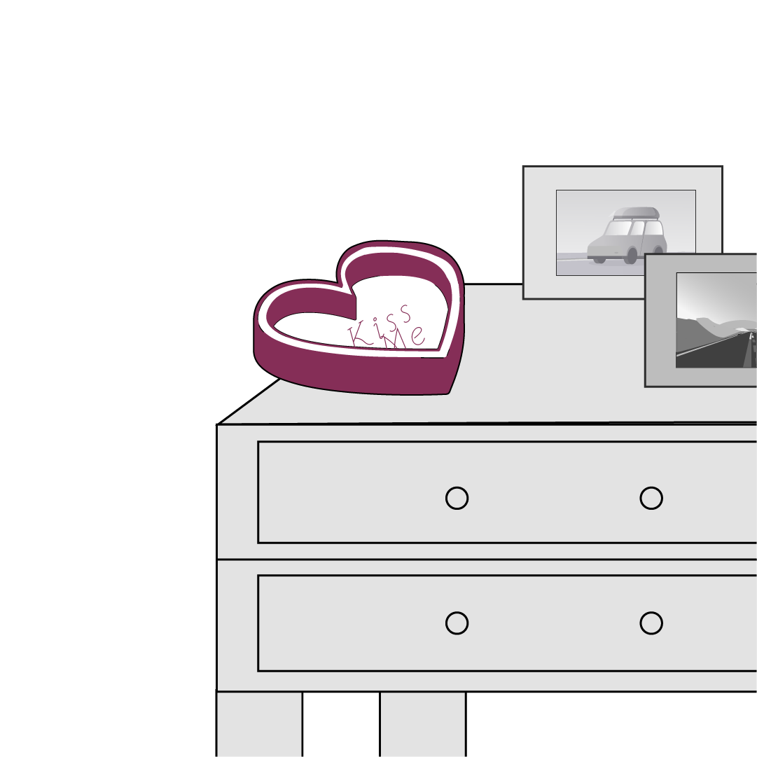 I have a small Valentine-shaped tray that reads “Kiss Me, Kiss Me” in my bedroom.