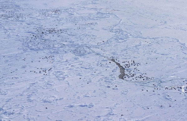 An aerial view of the ice floes dotted with harp seals and pups. Over the last five years, the ice in the area has become less stable, forcing the seals to move to new locations that make them more vulnerable to predators.SUPPLIED