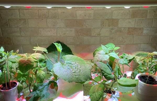 When seedlings poke up, remove the dome or wrap, and place containers by a sunny window, or under fluorescent or LED grow lamps for 14 hours daily. Expensive lamp models aren’t necessary; ordinary shop lights will do. Keep the light source no more than 2-4 inches above the plants, adjusting its height as the seedlings grow.