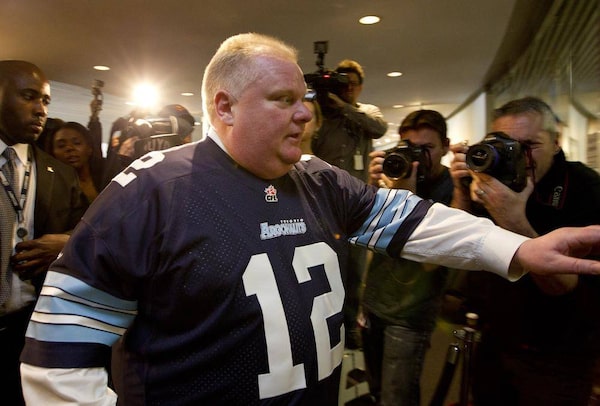 Mayor Rob Ford arrives at his office wearing an Argos jersey after leaving council chambers and prior to his press conference at City Hall in Toronto on November 14, 2013.Deborah Baic/The Globe and Mail