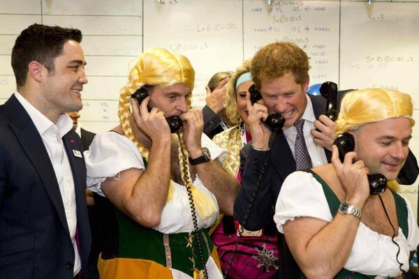 Last stop: Central London, where Prince Harry was enlisted to play the fool at The Annual ICAP Charity Day event. Step one: A prank phone call to his grandmother right during Corgi-feeding time. Cheeky lad!POOL/Reuters