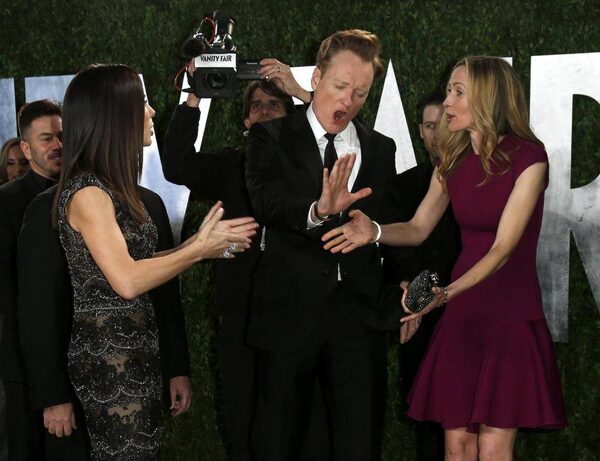 Conan O'Brien and his wife Liza discuss how long he talked to a certain Russian model at the Vanity Fair Oscars party in West Hollywood on Sunday.Danny Moloshok/Reuters