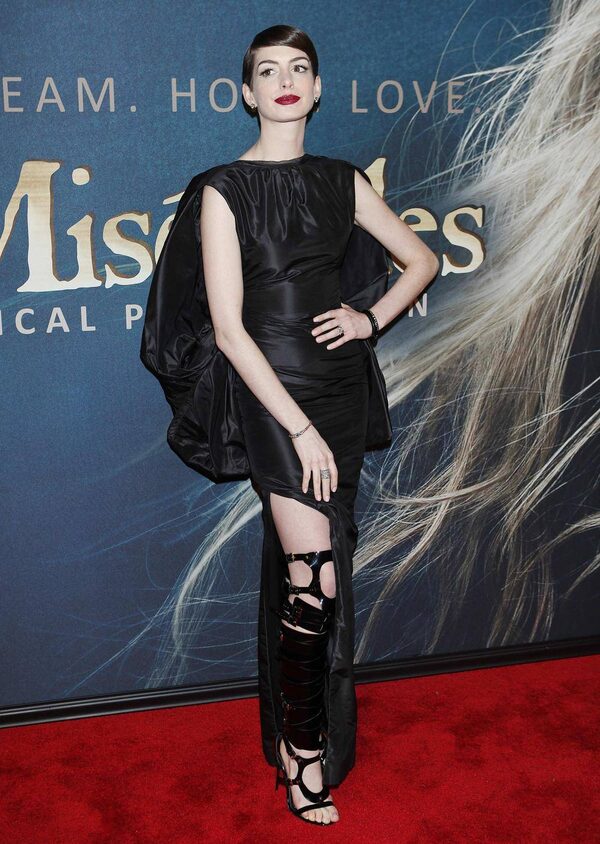Anne Hathaway, attending the premiere of “Les Miserables“ in New York on Monday, sports what is sure to not be a popular gift under the Christmas tree this year: the strappy Roman-sandal knee-brace fetish-wear boot stiletto shoe.Reuters
