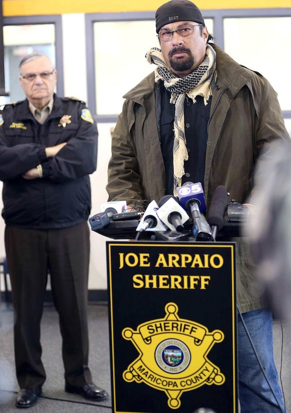 Maricopa County Sheriff Joe Arpaio (left) watches as actor Steven Seagal addresses the media in Fountain Hills, Arizona, last week. Arpaio enlisted the action film star to lead a training exercise for members of his armed volunteer posse on how to respond to a school shooting. Seagal suggested rappelling from a helicopter onto a train and fighting the shooter in hand-to-hand combat, almost losing, scrunching your eyes to look defiant, and then coming back and stabbing the surprised shooter in the neck WITH HIS OWN WEAPON and saying, “I think he got the point” as you walk away.Darryl Webb/Reuters