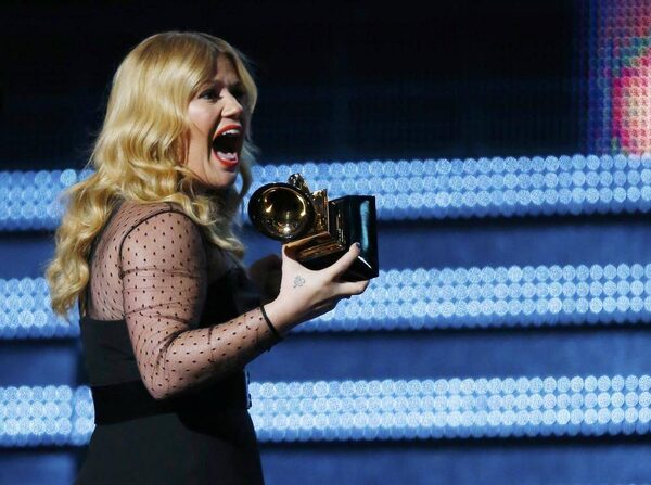 Kelly Clarkson accepts the Grammy for best pop vocal album as well as the challenge of putting the entire thing in her mouth.Mike Blake/Reuters
