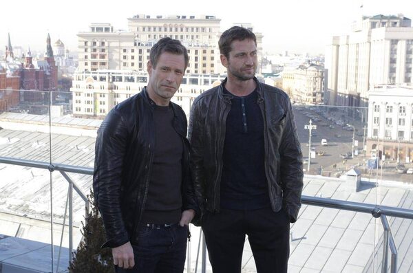 Aaron Eckhart, star of Olympus Has Fallen, poses last week on what is apparently the only balcony in Moscow on which Hollywood stars are allowed to be photographed.Ivan Burnyashev/Reuters