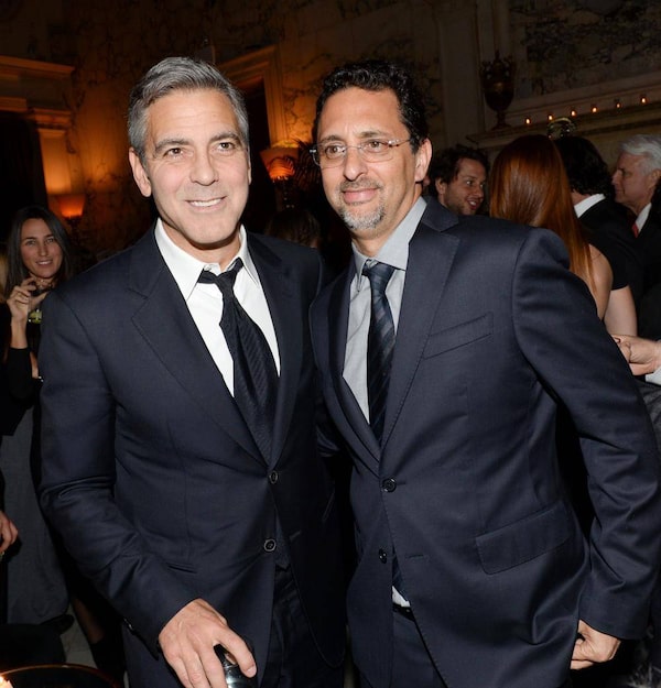The secret to the Clooney Method: When on a red carpet, only have your photo taken with nebbishy behind-the-scenes types, in this instance, his Monuments Men co-producer Grant HeslovEvan Agostini