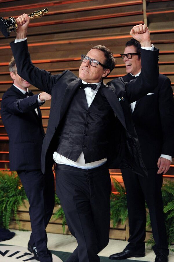 Also from last year's Oscars: David O'Russell's film American Hustle was blanked, but that didn't stop him from trying to make off with Spike Jonze's screenwriting trophy. Security intervenedEvan Agostini