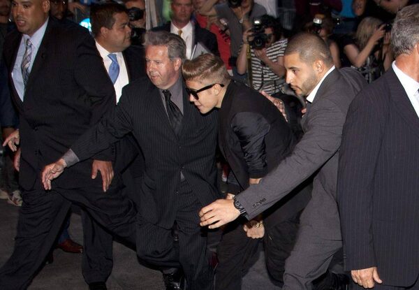 Singer Justin Bieber (C) arrives late for the premiere of the film "After Earth" in New York May 29, 2013.CARLO ALLEGRI/Reuters