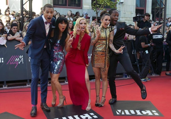 MuchMusic V-Jays (left to right) Scott Willat, Lauren Toyota, Liz Trinnear, Phoebe Dykstra and Tyrone "T-Rexxx" Edwards ham it up on the red carpet during the 2013 Much Music Video Awards in Toronto on Sunday June 16, 2013.Nathan Denette/The Canadian Press