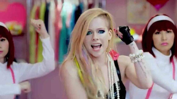 In the video, Lavigne wears a cupcake tutu and repeatedly uses Japanese phrases like arigato (Japanese for "thank you") as she dances around a candy store accompanied by several Asian background dancers.