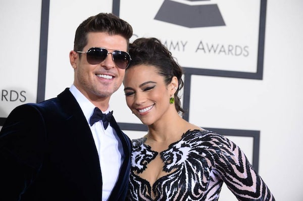 Robin Thicke, left, and Paula Patton arrive at the 56th annual Grammy Awards at Staples Center on Sunday, Jan. 26, 2014, in Los Angeles.Jordan Strauss/The Associated Press