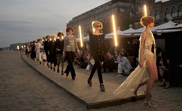 Models strut down the boardwalk during a recent showing of Chanel's cruisewear collection on the Lido in Venice. The Italian city was a favourite haunt of Coco Chanel, who went there in 1919 to get over the death of a lover.STRINGER/ITALY