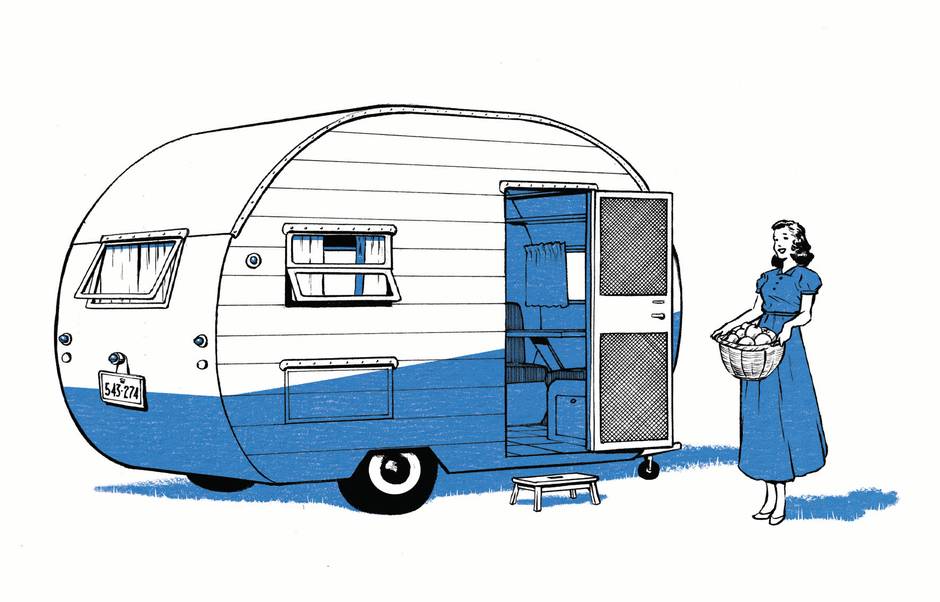 I get tired of climbing over my husband to go to the loo at night, so he turns the kitchen nook into a second bed. We cuddle and read together in a little snuggery, then he moves to sleep in the other bed. I pull the curtain and pretend I’m in a train berth. If it’s windy the trailer even gets train-shaky. At 6 a.m., my preawakening, I crawl into my husband’s bed-nest and go back to sleep for half an hour. This new arrangement is surprisingly romantic. Don’t come a-knockin’ when the trailer is a-rockin’.