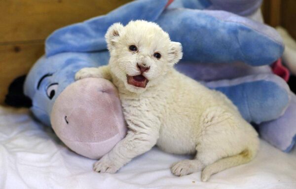 An eight-day-old white lion cub plays with a plush toy donkey at Belgrade’s Good Hope Garden zoo.MARKO DJURICA/Reuters