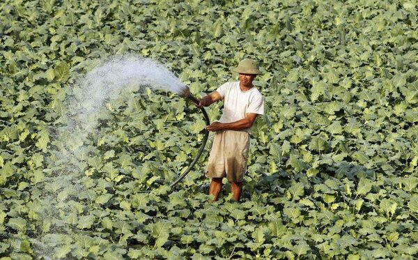 FIELD OF GREENS: A Vietnamese farmer waters his kohlrabi field in Thuong Tin district outside Hanoi.KHAM/Reuters