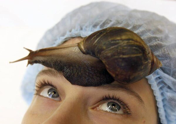 FACIAL FOOTPRINT: A spa customer in Krasnoyarsk, Russia, allows a land snail to crawl across her forehead in a skin-regeneration treatment.ILYA NAYMUSHIN/Reuters