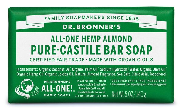 Dr. Bronner’s Pure-Castile Bar Soap uses fair-trade ingredients with zero chemical additives.