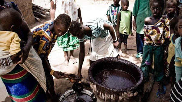 In Mali, the production of shea butter, a communal and exclusively female practice, is providing a welcome source of income for some rural women in the drought-stricken country this year. Typically, a halfdozen women and girls pound dried shea-tree nuts in a large village pestle as onlookers sing and dance. The crushed nuts are then cooked in a pot over an open fire, ground again into a paste, scooped out by hand and left to cool and harden into shea butter.Handout | Alyssa Bistonath | World Vision