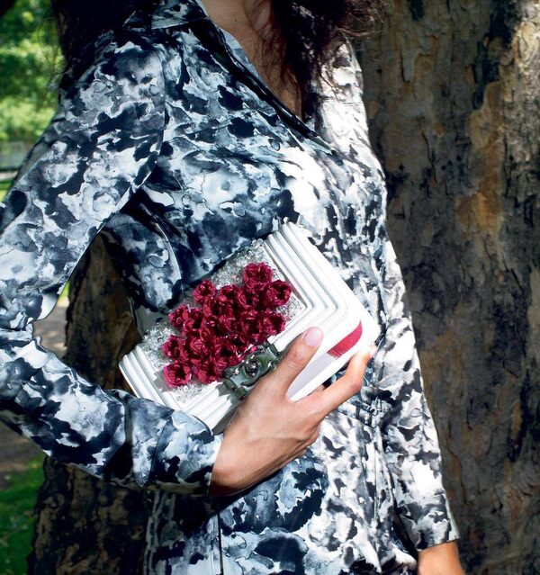 GARDEN VARIETY: Riffing on ready-to-wear’s prettiest petal prints, a structured clutch bearing plastic rosettes and elaborate beading provides a restrained backdrop for the playful feminine details. Chanel Boy bag, $8,450 at Chanel boutiques (www.chanel.com). Theory top, $275, pants,$275 at the Bay.Kevin Van Paassen/The Globe and Mail
