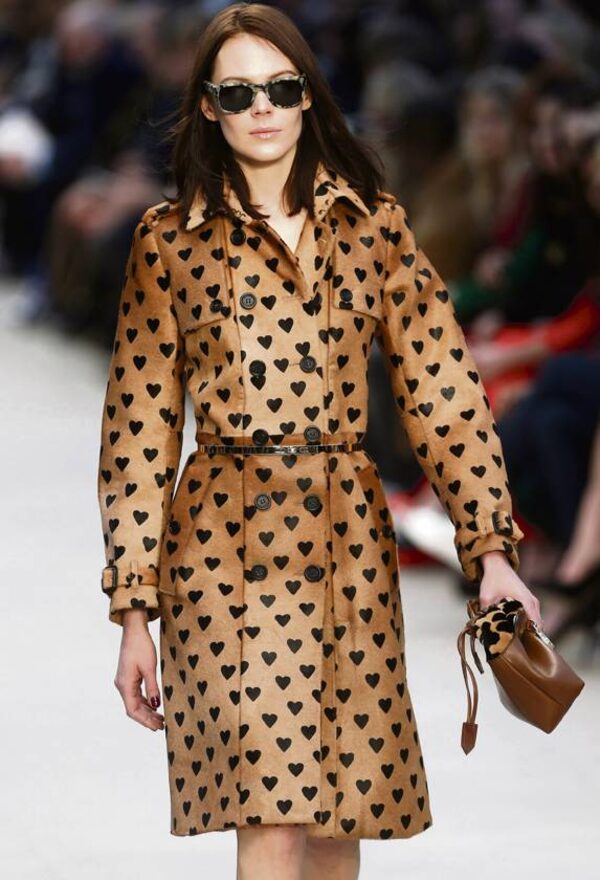 Sure enough, the collection featured a classic raincoat adorned in a heart pattern and giant metal hearts adorning evening wear. If this sounds overly romantic, he also hybridized trenches with translucent latex – as fetishistic as it was practical – and made a fiercer statement with rows of metal eyelets and giant animal spots. It was meant as an homage to British showgirl Christine Keeler, famous for her tryst with a government minister.