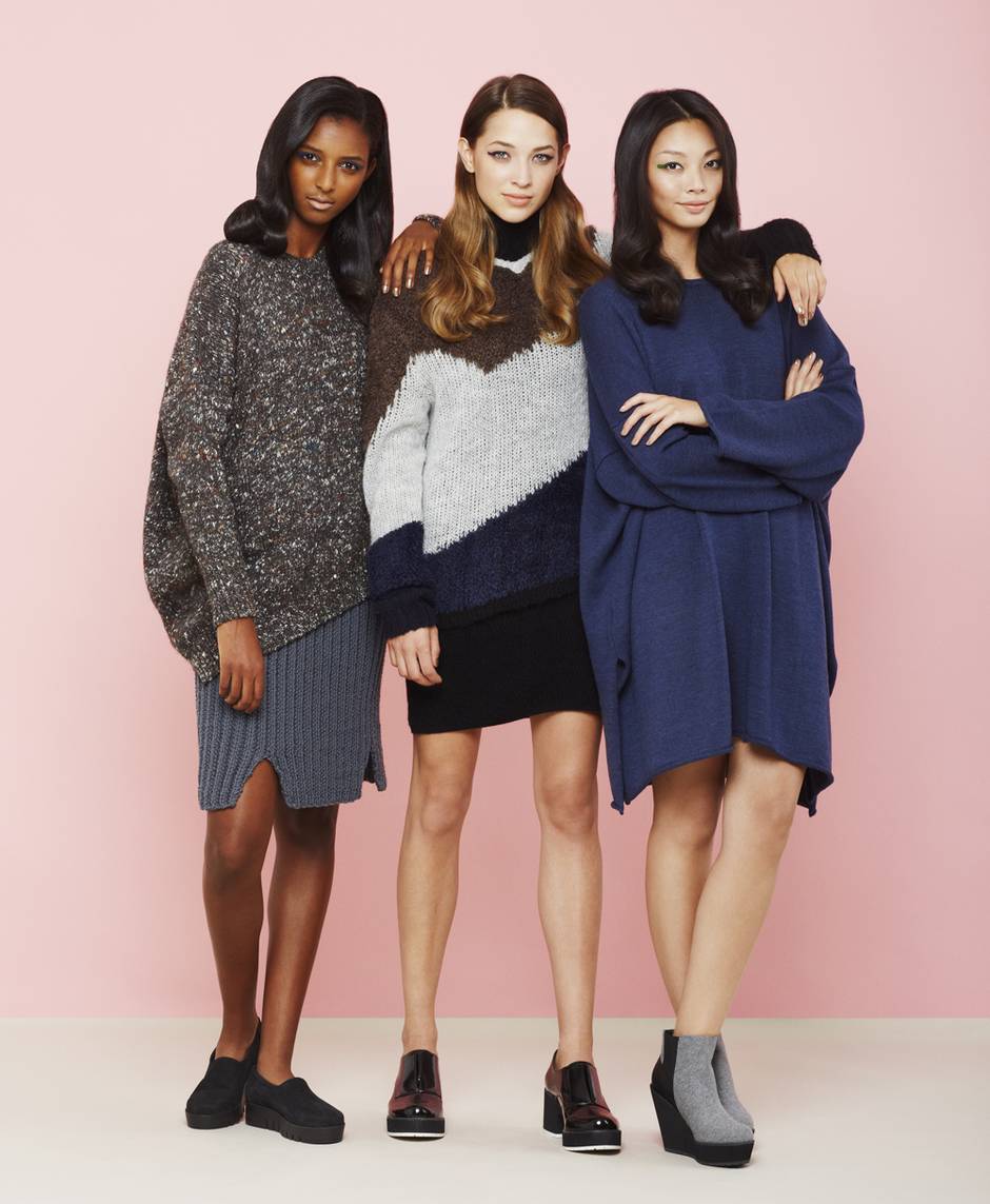 From left: Stella McCartney sweater, $1,060 at Holt Renfrew (www.holtrenfrew.com). Malorie Urbanovitch skirt, $375 through www.gravitypope.com. Jeffrey Campbell shoes, $129 at Capezio (www.capezioshoes.ca). Tibi sweater, $345 through www.tibi.com. Vince sweater dress (under Tibi sweater), $475 at The White Space at Hudson’s Bay (www.thebay.com). Shellys London boots, $120 at Capezio. Eskander sweater dress, $1,270 at Holt Renfrew. Shellys London boots, $110 at Capezio.
