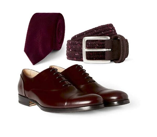 Tan, black and brown are stepping aside as warm, rich claret-hued accessories step into the spotlight. The oxblood hit list pictured here includes, from top, a corduroy tie by Band of Outsiders, a flecked woven belt by Anderson’s and deep-ruby oxfords by Mr. Hare. Bonus: Worries about red-wine stains can recede until at least the end of winter. Band of Outsiders corduroy tie, $140, Mr. Hare Miller High-Shine Leather Oxford Shoes, $570, Anderson’s leather-trimmed woven belt, $110 through www.mrporter.com.Andrew Soule/The Globe and Mail