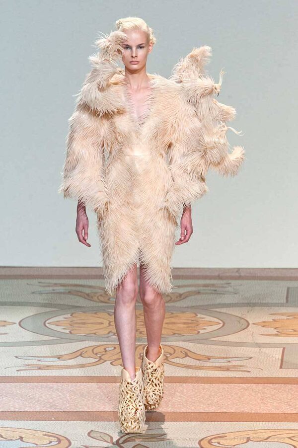 Iris Van Herpen on display at Couture Fashion Week in Paris, July 1, 2013. “I think people respond intuitively to these ideas with a mixture of fascination and disorientation; there’s a warmth to wildness,” Philip Beesley, a Toronto-based architect who collaborated with Van Herpen to produce silicon-based fabrics for this collection, said post-show.ANDREA ADRIANI