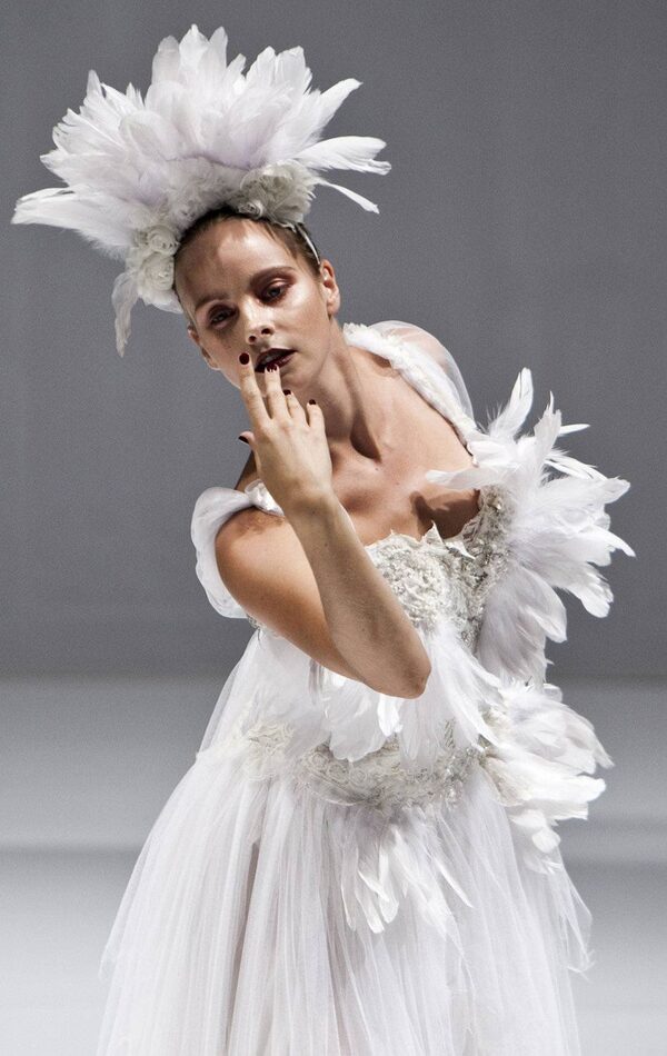 A model shows the design of Danish fashion house Wackerhaus at the restaurant Nimb in Copenhagen on August 4, 2011, during the Copehagen Fashion Week.ERIK REFNER