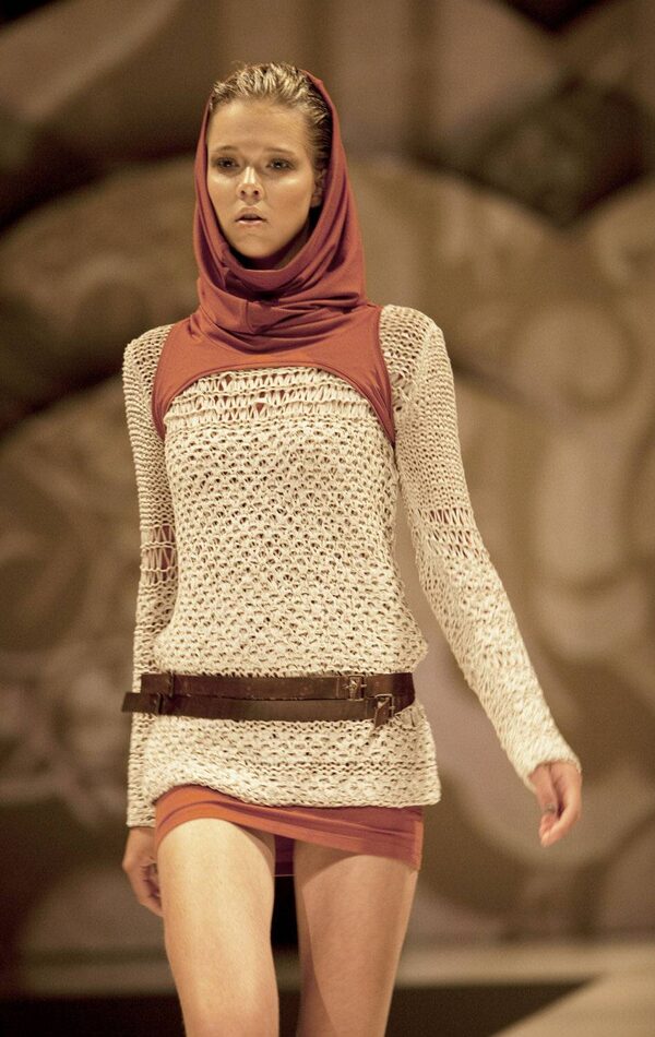 A model presents a creation from the Danish Design School at Copenhagen's Town Hall on August 4, 2011, during Copenhagen Fashion Week.ERIK REFNER