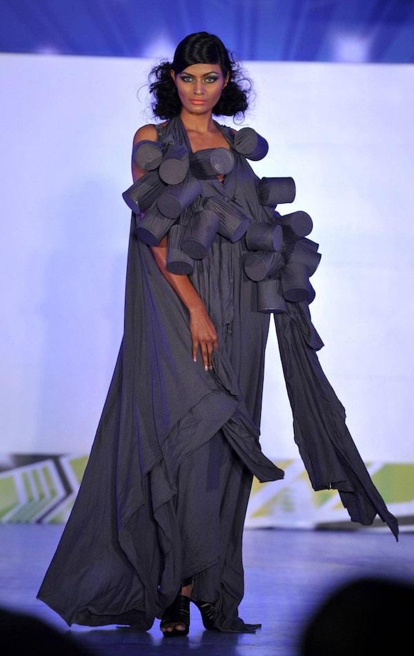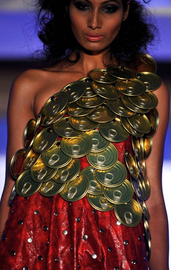 A model displays a dress made from recycled tin cans during the Canviroment Week 2011 event in Delhi late on December 14, 2011.SAJJAD HUSSAIN