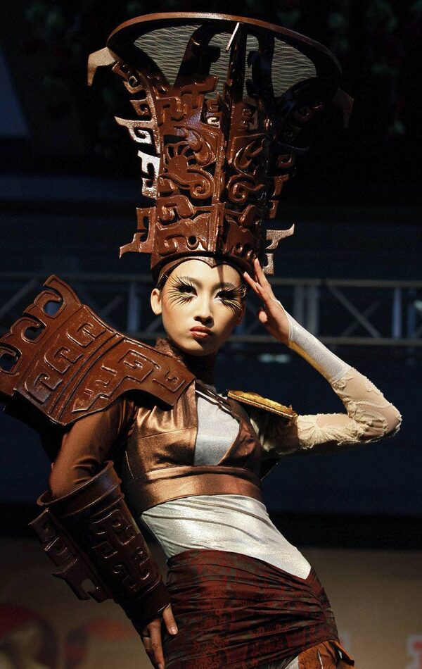 A model shows off clothing partially made of chocolate during a fashion show at the World Chocolate Wonderland in Shanghai, December 15, 2011.Eugene Hoshiko