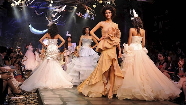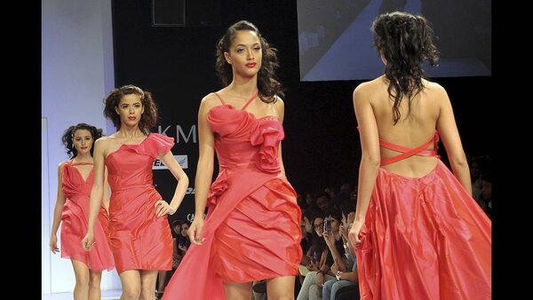 Indian models showcase designer Pallavi Mohan's creations during the Lakme Fashion Week in Mumbai, India, Tuesday, March 15, 2011.Rafiq Maqbool