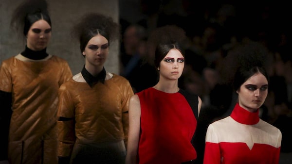 Models display Autum/winter 2012 creations by portuguese fashion designer Dino Alves during the 36th Edition of Moda Lisboa at Patio da Gale, Terreiro do Paco Square in Lisbon on March 13, 2011.PATRICIA DE MELO MOREIRA
