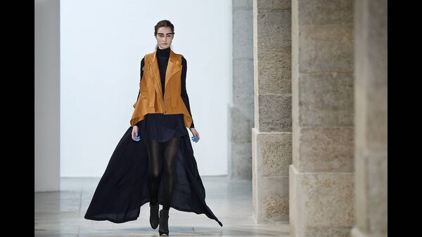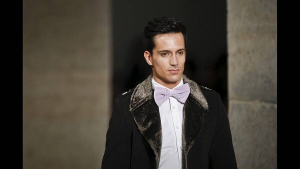 A model displays a Autum/winter 2012 creation by Portuguese fashion designer Ricardo Dourado during the 36th Edition of Moda Lisboa at Patio da Gale, Terreiro do Paco Square in Lisbon on March 13, 2011.PATRICIA DE MELO MOREIRA