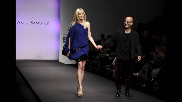 Czech model Karolina Kurkova walks with Venezuelan designer Angel Sanchez after Sanchez presented his collection at the Mercedes-Benz DFashion show in Mexico City March 11, 2011.HENRY ROMERO