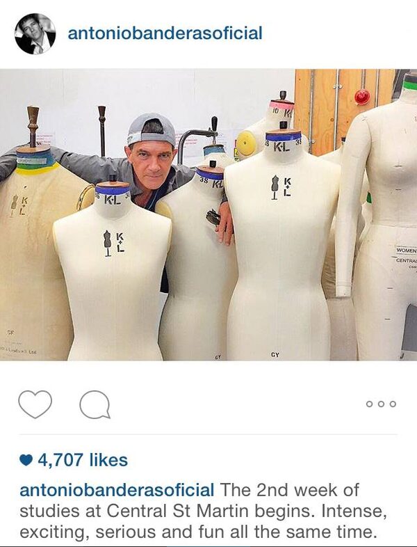 Actor Antonio Banderas poses with a group of dressforms at Central Saint Martins, where he is studying fashion design. According to his Instagram, the program is “Intense, exciting, serious and fun”.