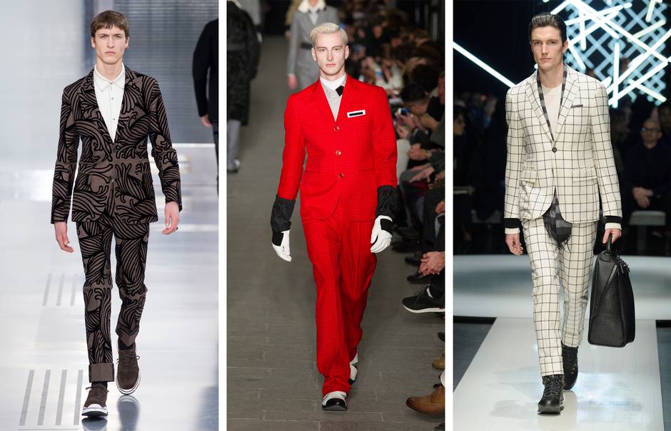 In a variety of cuts from slim to outsized and ranging from glam-era plaids to groovy marbleized patterning, head-turning suits reign this season. Louis Vuitton made a case for opulent Arts & Crafts-style motifs, while Andrea Pompilio’s red-checked look has an updated 1940s flair. Canali’s black-and-white suit, paired with simple monochromatic accessories, makes a subtler statement. The key to making this look work is to either pare down (sticking to neutral shirting) or amp up (accenting with a colour). Pick your pleasure and go forth with gusto. (Imaxtree)