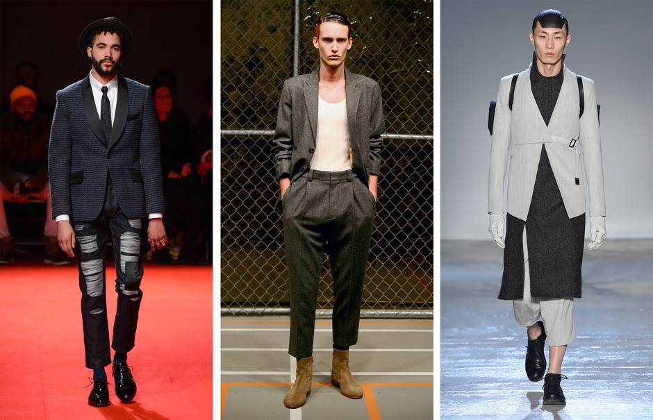 Baring ankles during the summer is already a tall order for many gents. But, according to designers such as Robert Geller and Junya Watanabe, who showed trousers hems several inches higher than the seasonal norm, skin is in for at least a few more months. The easiest way to wear them in cool weather is to pair them with ankle boots (or, for a jolt of personality, with statement socks and laceups). (Geller courtesy of Robert Geller; Imaxtree)