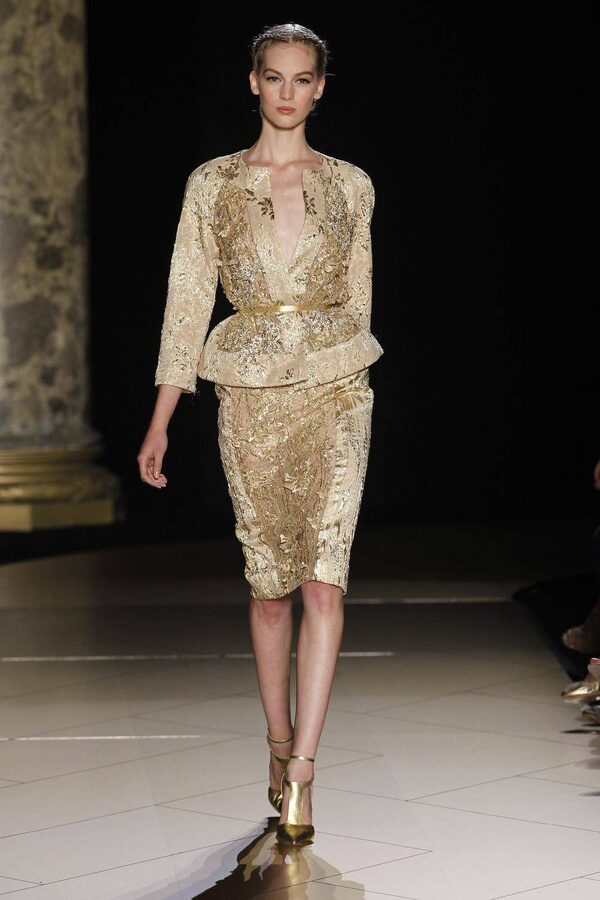 And for occasions that require just a little less volume, Saab presents the same level of luxury on two-piece suits; this one is covered in shimmery gold beading. Attention, Kate Middleton.GONZALO FUENTES/Reuters