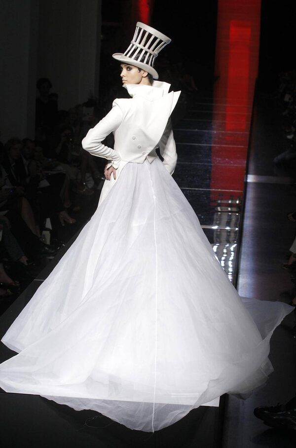 Gaultier’s bridal gown this season was a reworking of the classic bar jacket in a way that recalled Celine Dion’s Oscar backward ensemble from 1999. Fortunately, this dress did not suffer from such awkward tailoring, instead capping off a collection that shook up masculine-feminine codes with sexy sprezzatura.Jacques Brinon/The Associated Press