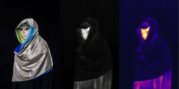 The garments, which also include an abbreviated hoodie and a scarf, are made of a flowing metallic fabric that reflects heat. Put on Harvey's burka, and it will prevent your body's "thermal signature" from reaching the eye of an infrared camera.