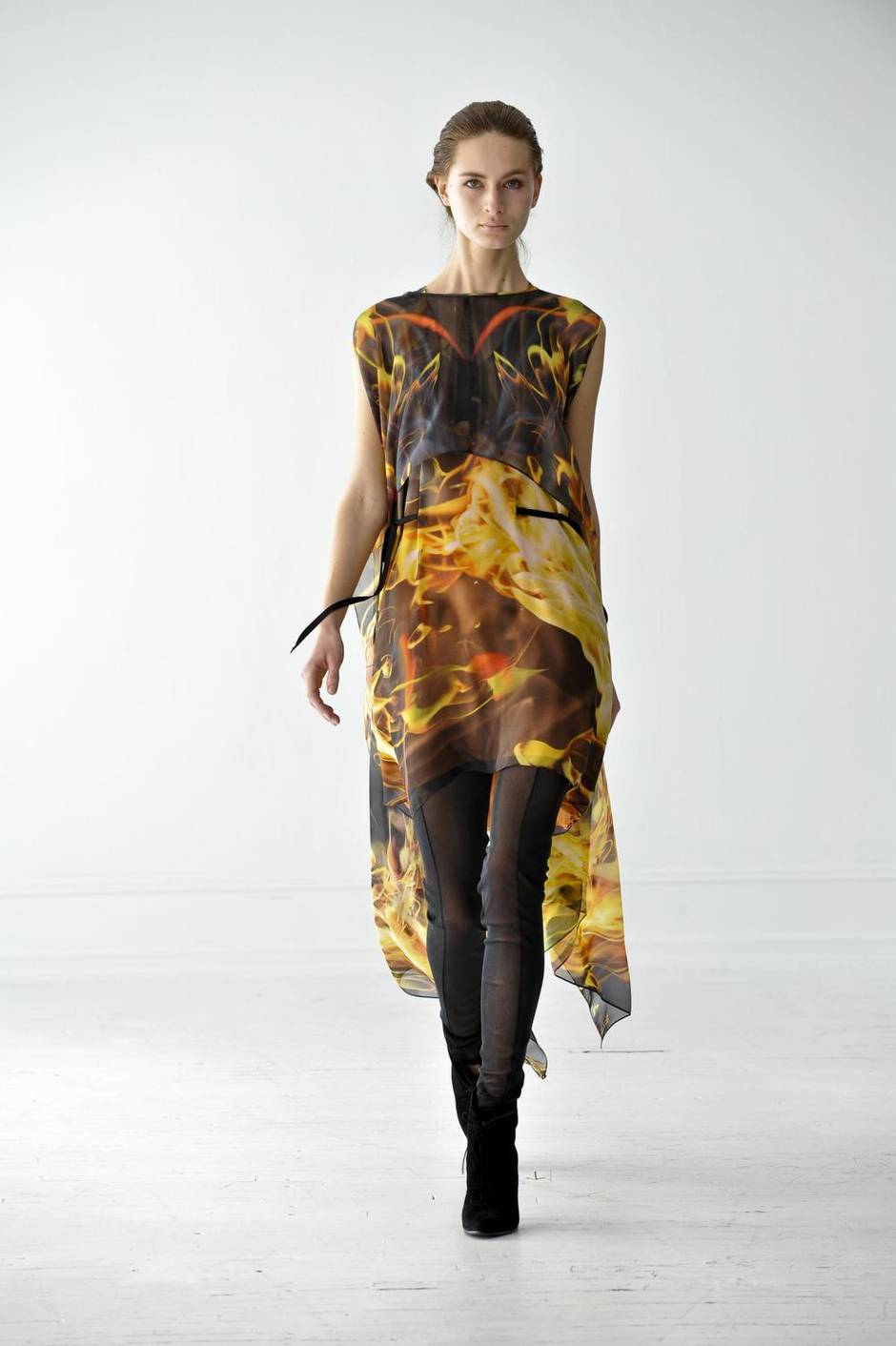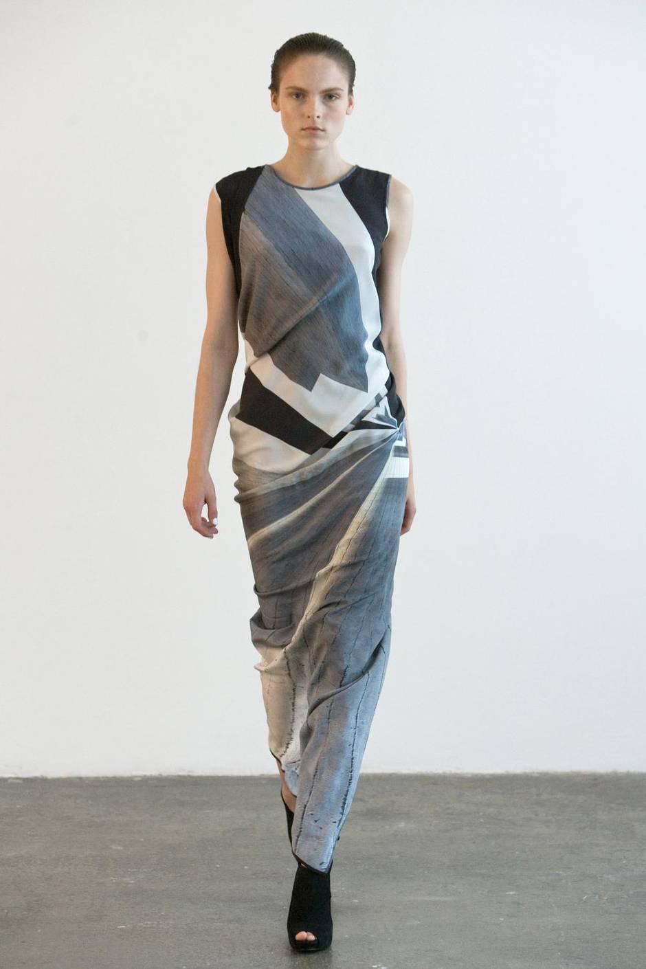 “This dress is made in one piece, has four armholes and no seams other than at the shoulders; getting into it requires some practice. Constructed as a cone, tapering to literally nothing at the hem, the dress wraps and distorts itself around the body, acquiring shape in the process. The print was created with architectural rendering software and represents a modern-day “folly,” with a vanishing point placed deliberately at the left hip. spring/summer ’10
