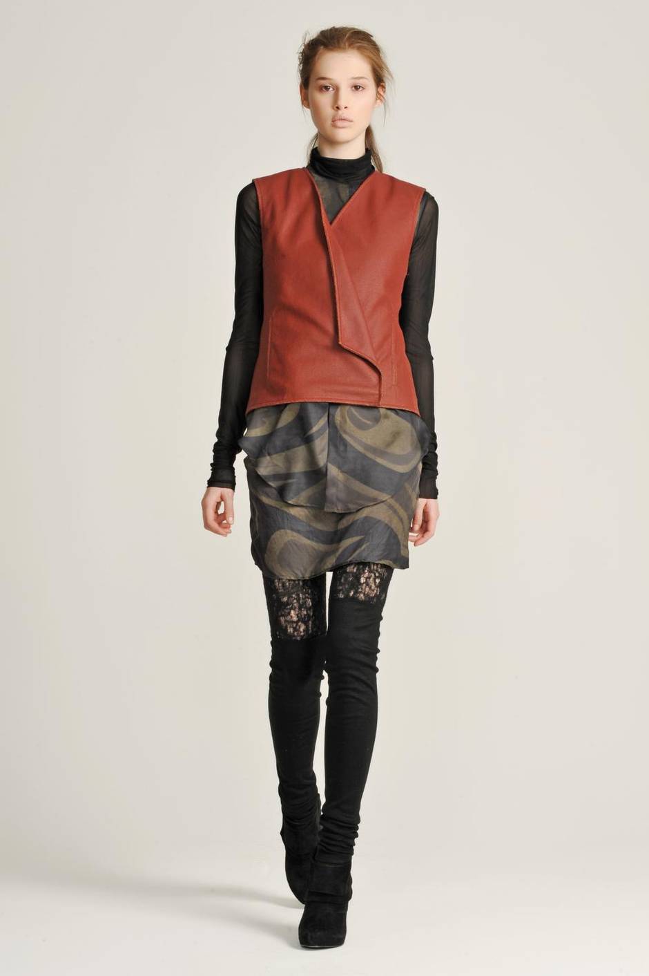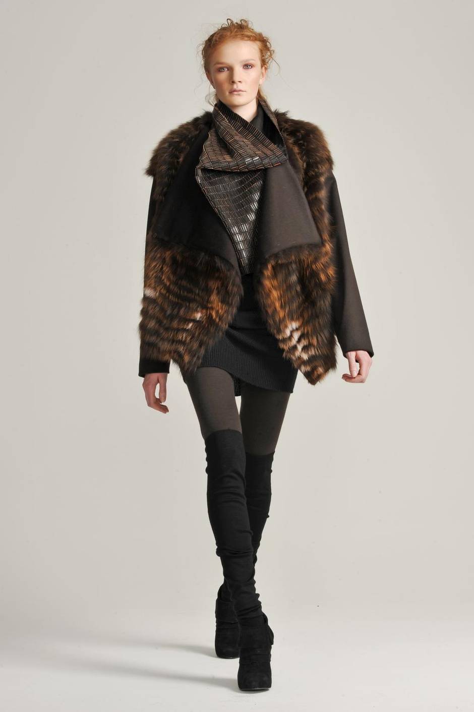 “Inspired by the Canadian wilderness, this collection included wild-trapped fur. We took this jacket to Vogue as part of our preview. It was tried on around the office and appeared on their blog that day. The neck piece is silk organza covered in a multitude of hand-sewn leather paillettes, reminiscent of West Coast native basket work.” fall/winter ’10