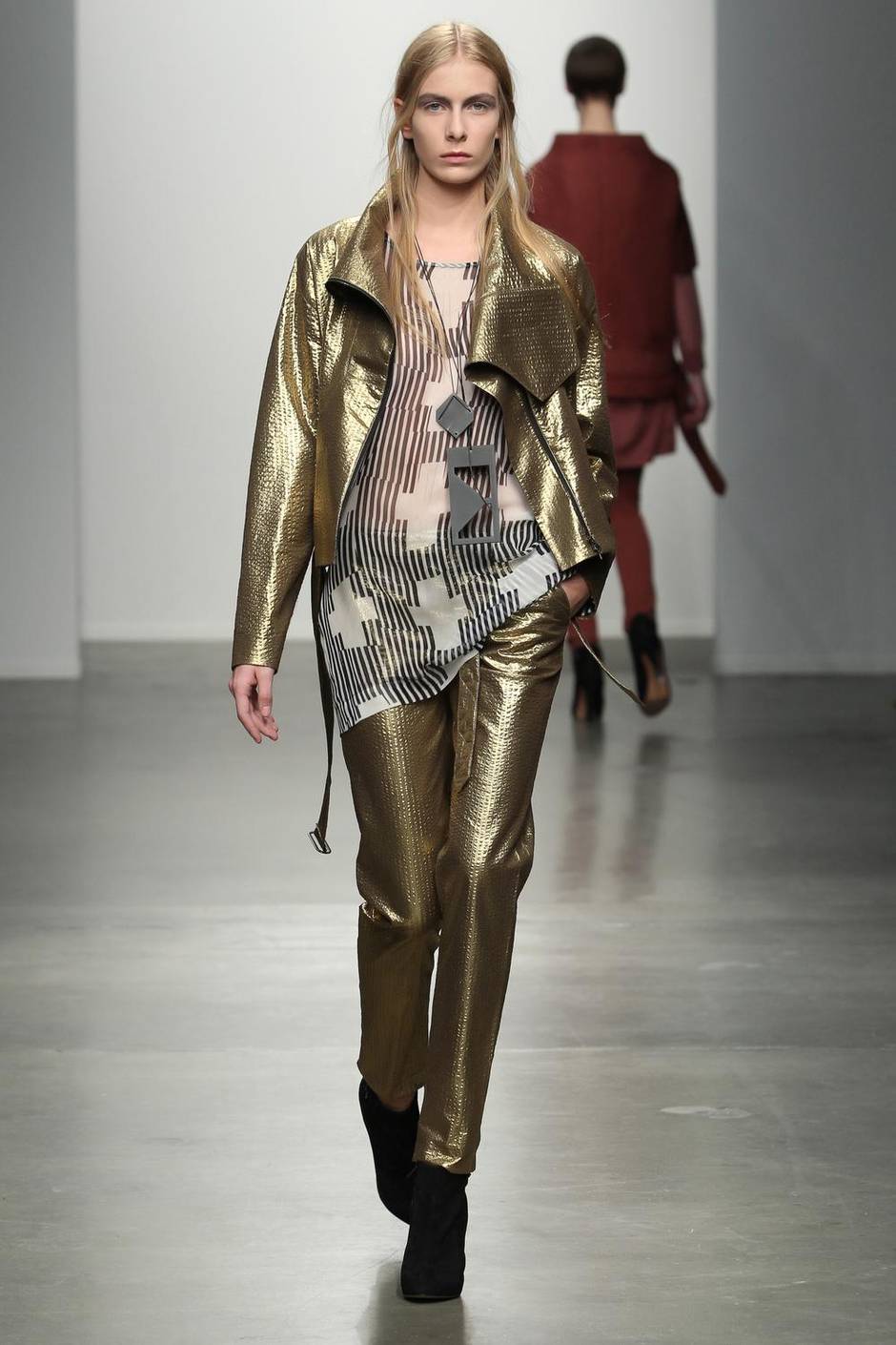 “Why not a gold-foil-stamped seersucker snowboarder jacket? The necklaces’ and the top’s print are part of a collaboration with the artist Vanessa Maltese. The painting they were based on still hangs in my studio.” fall/winter ’13