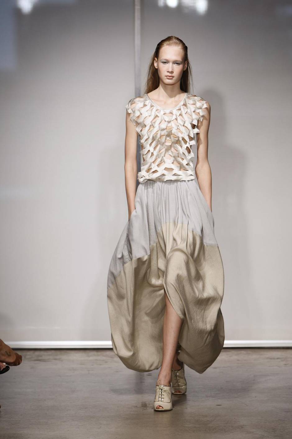 “Sew two gigantic circles together, pick up the combined piece from a point slightly off centre, cut holes for legs and waist and, voila, a ‘Lantern’ skirt with a nod to Madeleine Vionnet, a particular idol of mine. The top is silk satin and hand-embroidered with horizontal linear channels. Each channel is slit, causing it to open up and the top to grow in length. spring/summer ’09