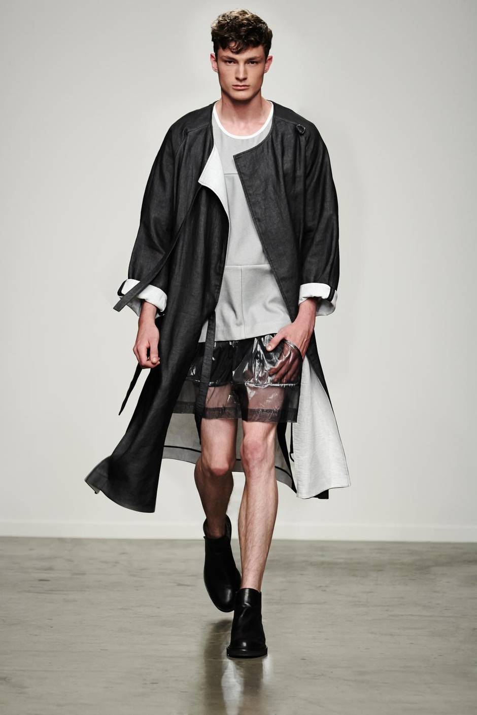 “By this season, I had a hunch there might not be another – let’s say my sense of engagement was suffering – so I decided to do some men’s looks for my own enjoyment as well as shoes in collaboration with LD Tuttle. The sheer shorts are a joke of course, but the rest of the look I’ve worn.” spring/summer ’14