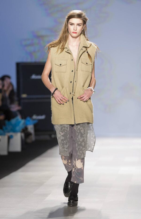 Prints, a label signature, were ornate and almost baroque-like, but mussed up with darker hues and etched on leather. Hems were left unfinished, which in this case looked artistic not accidental.