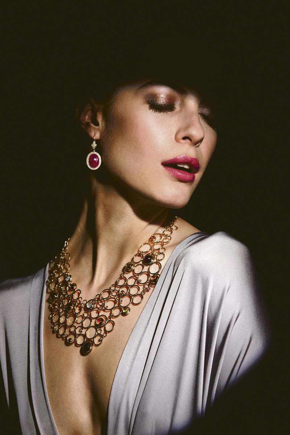 Pear rose-cut ruby earrings, $4,160 at Anne Sportun. 18-carat yellow-gold Genesis necklace, $20,300 through www.mindham.com.